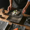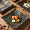 Prato quadrado em cerâmica com textura marcada e acabamento escuro de inspiração japonesa. Ideal para servir sushi, steak, saladas ou pratos contemporâneos, valorizando a apresentação com estética rústica e sofisticada.